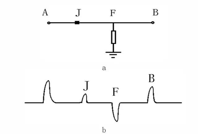 圖 2.a 給出了一個(gè)有低阻故障的電纜,中間有接頭J,圖2.b給出了向電纜注入一低壓脈沖測(cè)得的脈沖反射波形。類似于透視用的X光片,被測(cè)電纜結(jié)構(gòu)(狀態(tài))以波形的形式直觀地呈現(xiàn)在儀器的屏幕上。