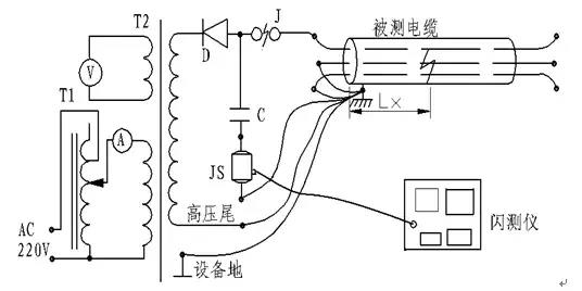 高壓閃絡(luò)測試法主要適用于測試電纜的高阻泄漏性故障及高阻閃絡(luò)性故障。對于各種低阻故障,在低壓脈沖測試完畢后,也可用高壓閃絡(luò)法做驗證測試。高壓閃絡(luò)法又分為沖擊高壓閃絡(luò)法(沖閃法)和直流高壓閃絡(luò)法(直閃法)。下面分別介紹: