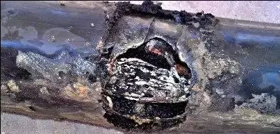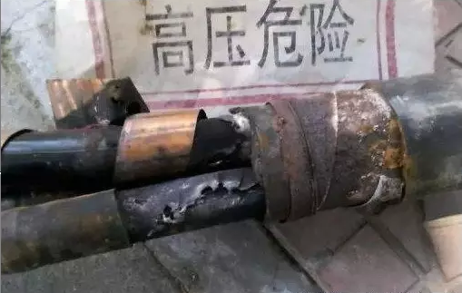 在加大放電間隙,提高放電電壓后,經(jīng)過仔細(xì)定點(diǎn),難以找到故障點(diǎn)精確位置,只能用特殊的方法,給故障點(diǎn)加壓,確定了故障點(diǎn)位置。開挖后,找到了接頭,但是,接頭外觀完好,加壓沖擊,接頭上并沒有明顯放電聲音,用定點(diǎn)儀探頭仔細(xì)判斷,確定接頭內(nèi)部有故障。因?yàn)楣收戏烹娐曇舨幻黠@,用戶研究請(qǐng)示后,才破開接頭,看到了故障點(diǎn)(接頭內(nèi)部非常潮濕),接頭故障如圖5所示。