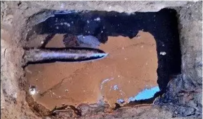 接頭故障排除后,檢測(cè)絕緣,死接地故障還存在,用閃測(cè)儀重新測(cè)試,波形基本與前面測(cè)試波形一樣,測(cè)試的故障距離為606米,還是用特殊的方法加壓沖擊,,用定點(diǎn)儀定點(diǎn),在接頭位置前面10多米處,確定了故障點(diǎn)。因?yàn)榕懦私宇^故障點(diǎn),這次精確定點(diǎn),放電聲音明確,用戶開挖后,發(fā)現(xiàn)了故障點(diǎn),并且,故障點(diǎn)完全開放泡在污水中,如圖6、圖7所示: